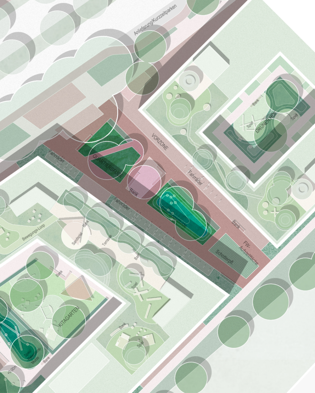In der Überlagerung von öffentlicher Quartiersfuge, privaten Hofräumen und aktivierten Dachlandschaften entsteht ein vielschichtiges Freiraumsystem, das die Anforderungen an klimaangepasste Stadtentwicklung mit einer hohen Aufenthalts- und Nutzungsqualität im Alltag verbindet.