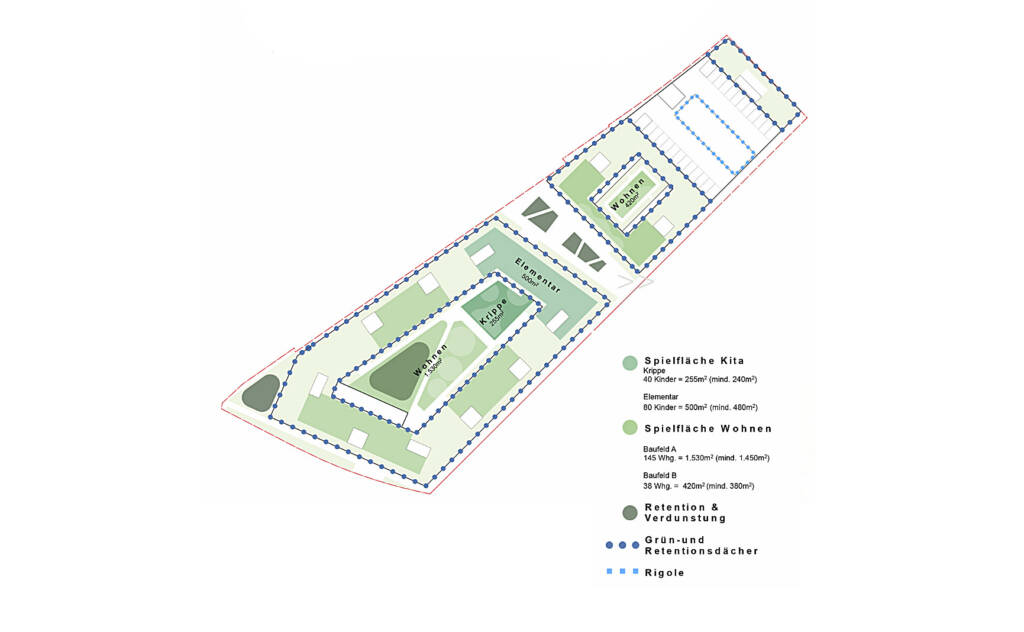 Intensive und extensive Begrünungen, modellierte Topografien und Baumpflanzungen ermöglichen nutzbare Aufenthalts- und Spielflächen für Kita und Bewohner*innen und leisten gleichzeitig einen Beitrag zur Retention, Verdunstung und Förderung der Biodiversität.